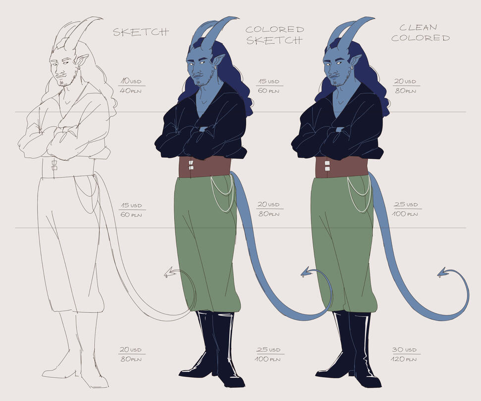 3. The price of the commission may vary slightly (within 5USD / 20PLN at most) depending on the complexity of design, the quality of reference you provide etc.